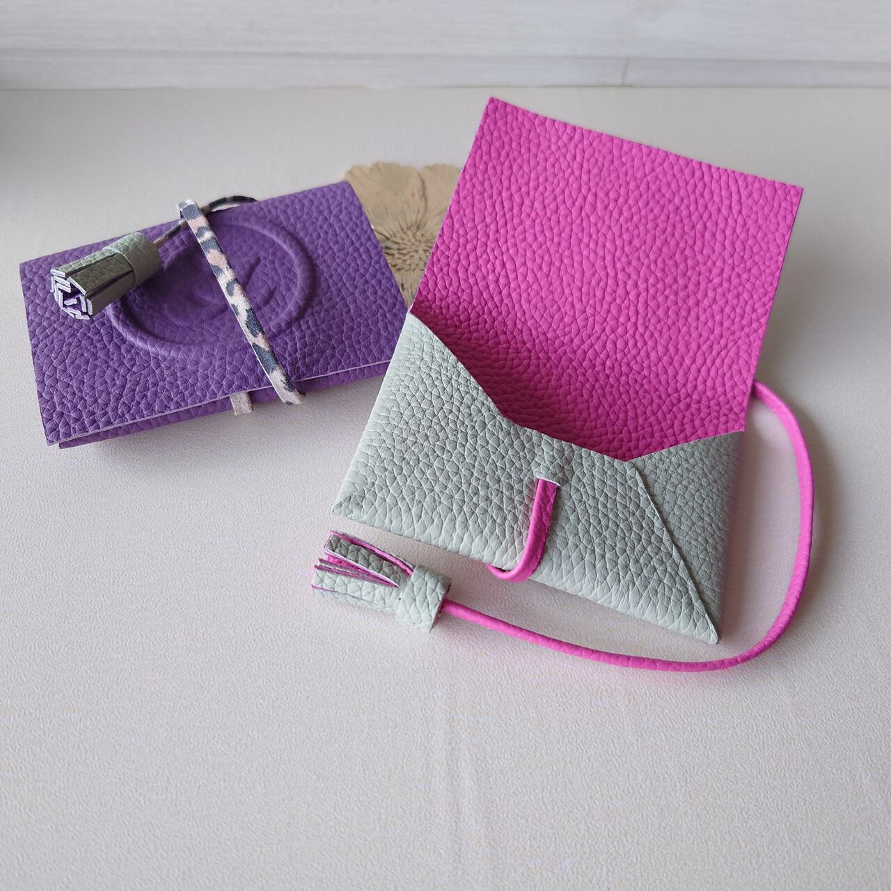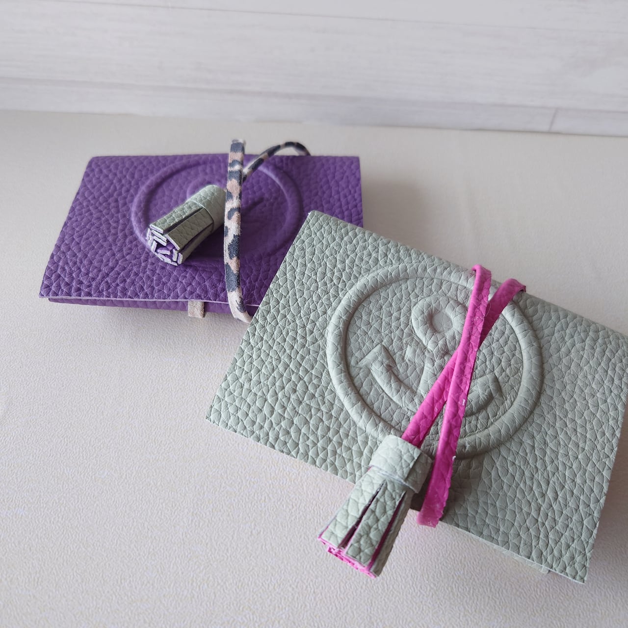*画像は①バイオレットxパールグレー(*紐のみレオパード)②パールグレーxフューシャヒピンク